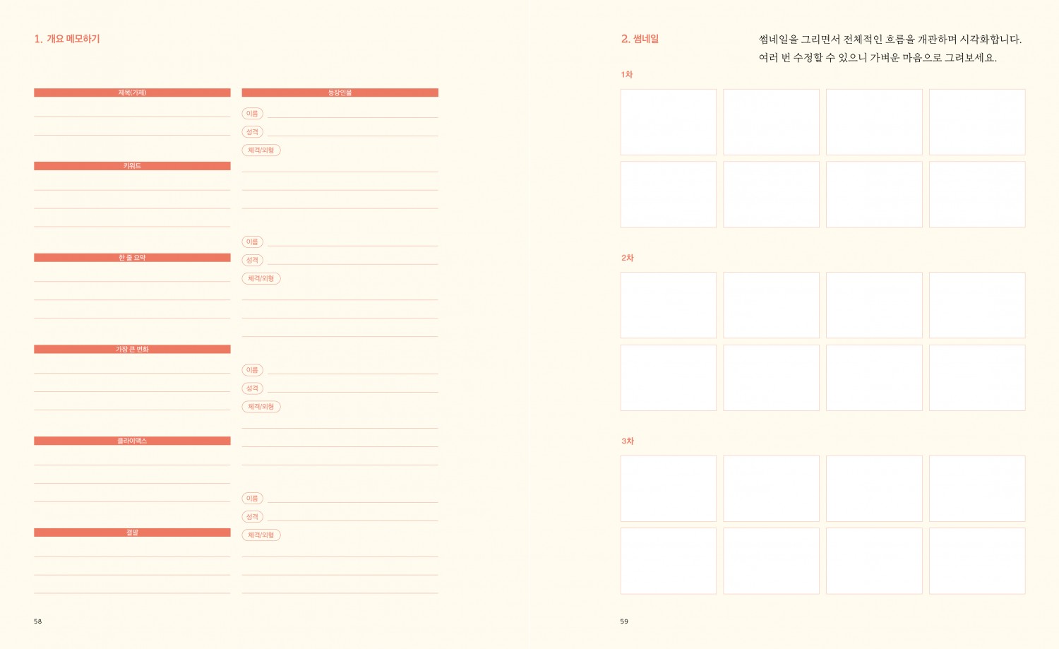 책은 크게 1부와 2부로 나뉜다. 1부는 매체로서 그림책 전반을 이해할 수 있는 기본 지식을 다룬다. 2부는 1부를 바탕으로 실제 더미북을 만드는 단계별 과정으로 이루어진다. 이 같은 구성 아래 총 20개의 챕터가 주간별로 짜여 있어 각 챕터를 한 주에 하나씩 따라가면서 더미북을 완성할 수 있다.